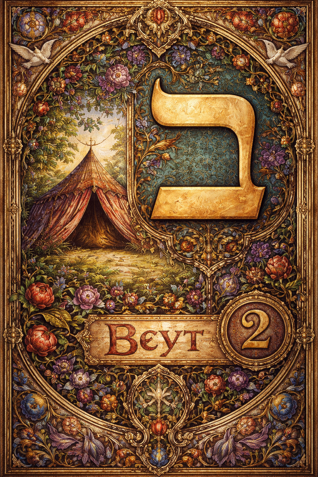 A picture of the Hebrew letter Beyt including both the paleo symbol of the bedouin tent meaning and also the modern Hebrew Beyt symbol ב , the number 2 and the name of the letter "Beyt"