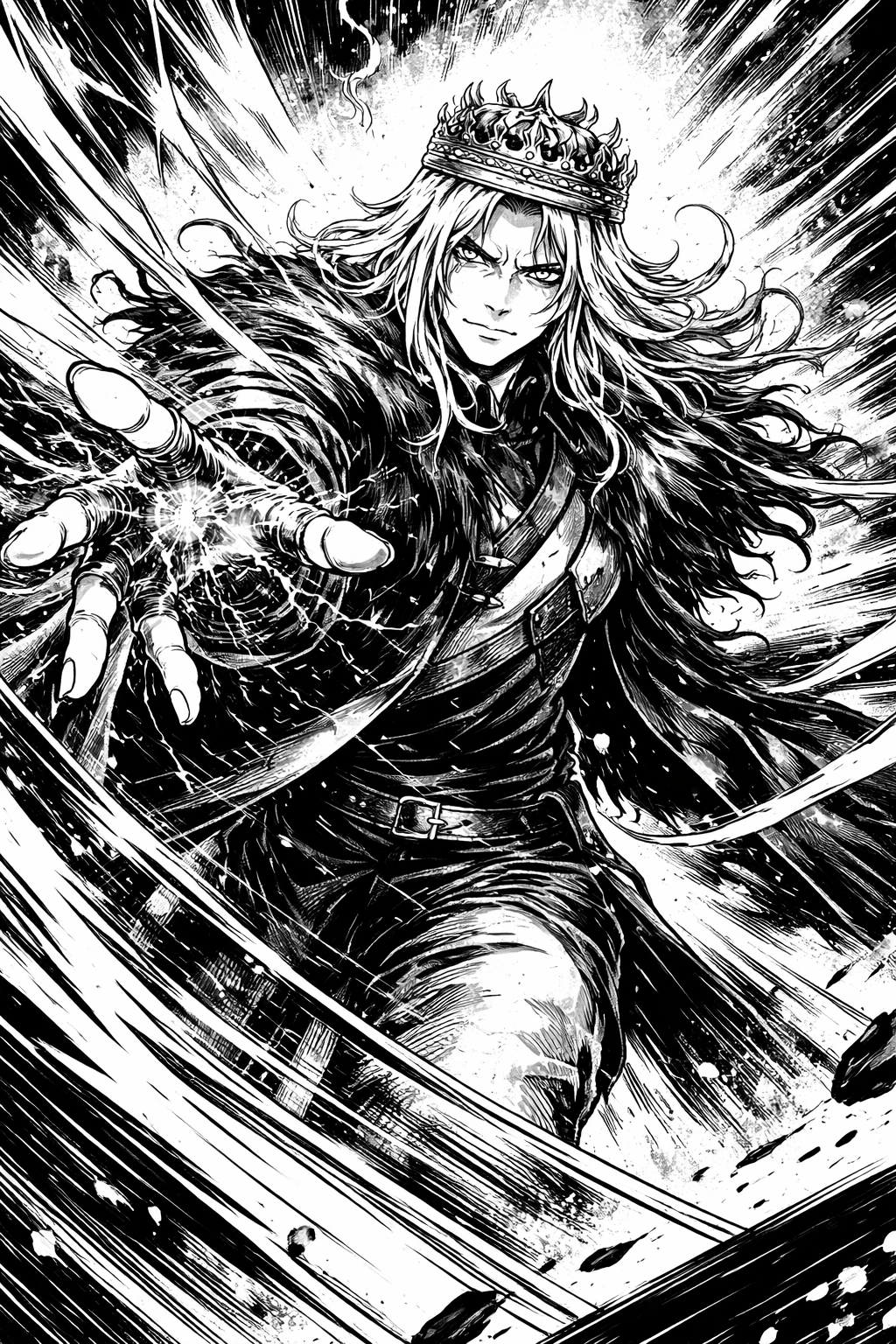 This shonen battle manga art style emphasizes dynamic action through bold ink work and explosive panel layouts. Featuring heavy speed lines, impact bursts, and dramatic facial expressions, it captures the intensity of combat scenes in black and white.