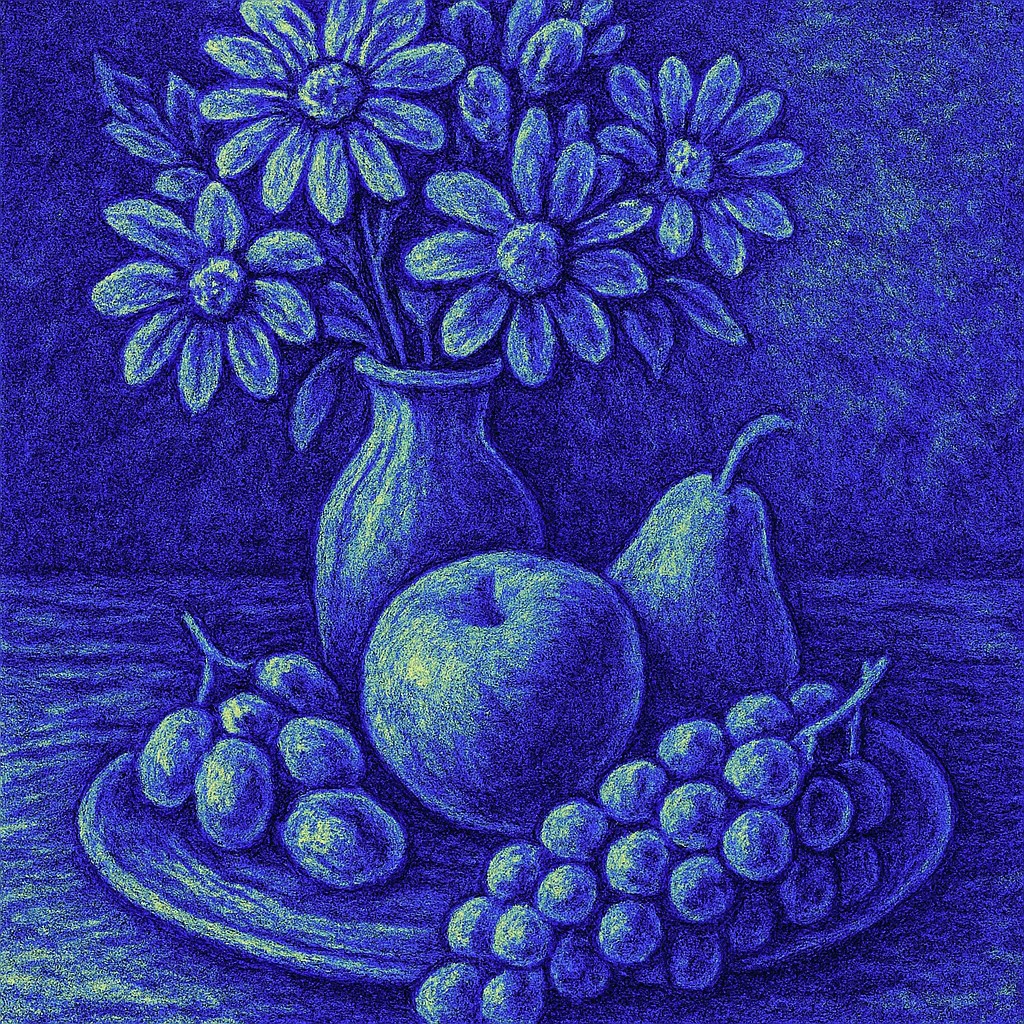 This style is characterized by a stark, high-contrast palette predominantly featuring vibrant blues and greens, often with an inverted coloration effect. The imagery exhibits a gritty texture and strong color quantization, leading to a pixelated or grainy appearance. Forms are defined less by subtle shading and more by the abrupt juxtaposition of these intense, often complementary, hues, creating a digital and somewhat distorted sensory experience. The overall effect is raw, electric, and surreal, emphasizing sharp edges and an almost monochromatic yet highly saturated feel.
