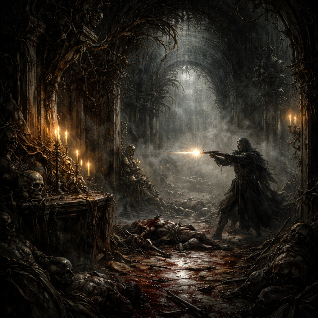 I suoni della battaglia svaniscono lentamente, finché nel silenzio assoluto risuona un singolo sparo di pistola.