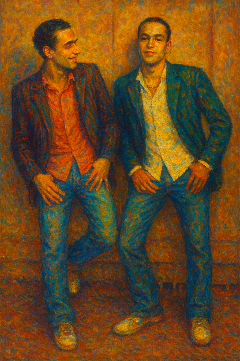 a painting of two men standing next to each other