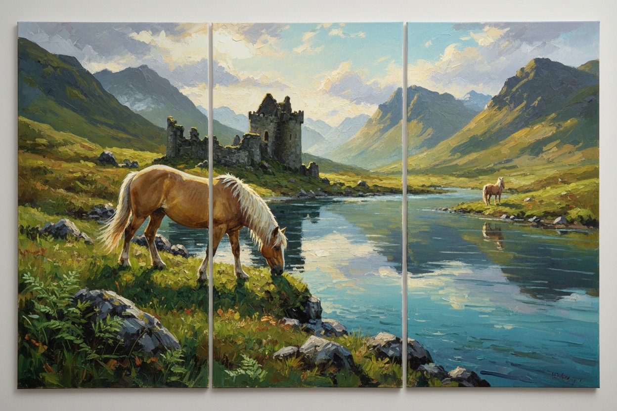 A triptych set of three drawings, continuous scene flowing left to right, left panel shows a palomino horse in the foreground on the far left side of the scene walking down a grassy slope toward a reflective teal-blue river in the Scottish Highlands with rocks and ferns around its hooves. Center panel continues the same landscape as the horse now appears in the midground at the center of the scene standing at the river’s edge drinking from the reflective water beside ancient moss-covered stone ruins. Right panel continues the scene as the horse appears far away in the distance on the far right side of the scene following the riverbank toward steep mist-covered mountains with dramatic sunlight breaking through the clouds, unified natural palette of greens golds and reflective teal blues, consistent cinematic lighting, shared horizon line, smoothf uninterrupted left-to-right visual flow with no panel separation.