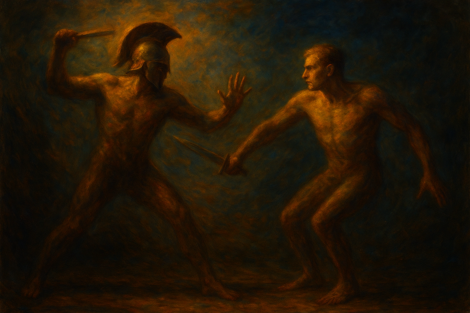 a painting of two men fighting with each other