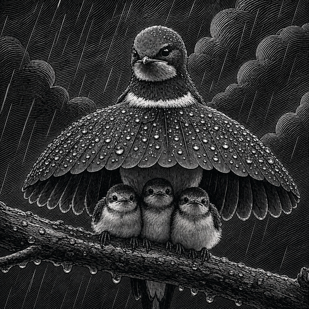 a black and white drawing of three birds sitting on a tree branch in the rain