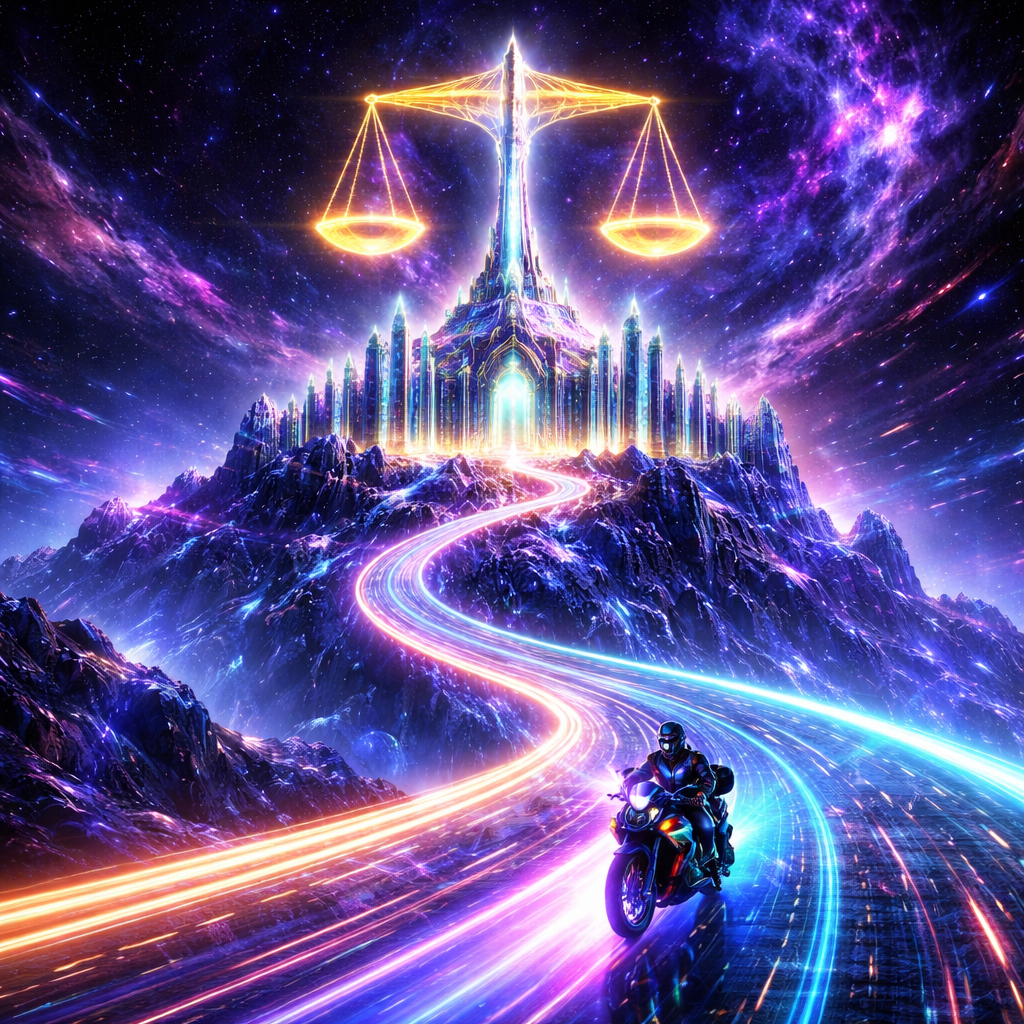 Neon-Futurism Digital Art Style, Bioluminescent Sci-Fi Cosmic Setting, Grandiose Architectural Scale. A sweeping vista of deep space, where the Ecliptic is a glowing laser-grid highway curving towards a monumental structure. The Rider: The lone rider in the sleek, glowing armored suit and helmet on the neon light-sportbike is small in the frame, speeding along the light path, giving a sense of immense scale to the scene. The Heavenly Mountain: Rising from the cosmic void ahead is not an earthen mountain, but a colossal "Heavenly Mountain" formation made of crystallized nebulae, glowing geometric rockforms, and compressed stardust in shades of deep indigo, violet, and electric blue. The Temple of Libra: Perched majestically at the flat summit of this cosmic mountain is the "Great Courtly Temple of Libra." It is a massive, balanced structure of glowing classical architecture re-imagined with light-lines—towering columns of cyan light, archways of golden data streams, and balanced spires. The Icon: The central feature, integrated into the highest point of the temple, is a gigantic set of perfectly balanced Cosmic Scales. The pans and beam of the scales are constructed from radiant, golden energy and concentrated star clusters, shining brightly against the dark space background, symbolizing divine justice and order
