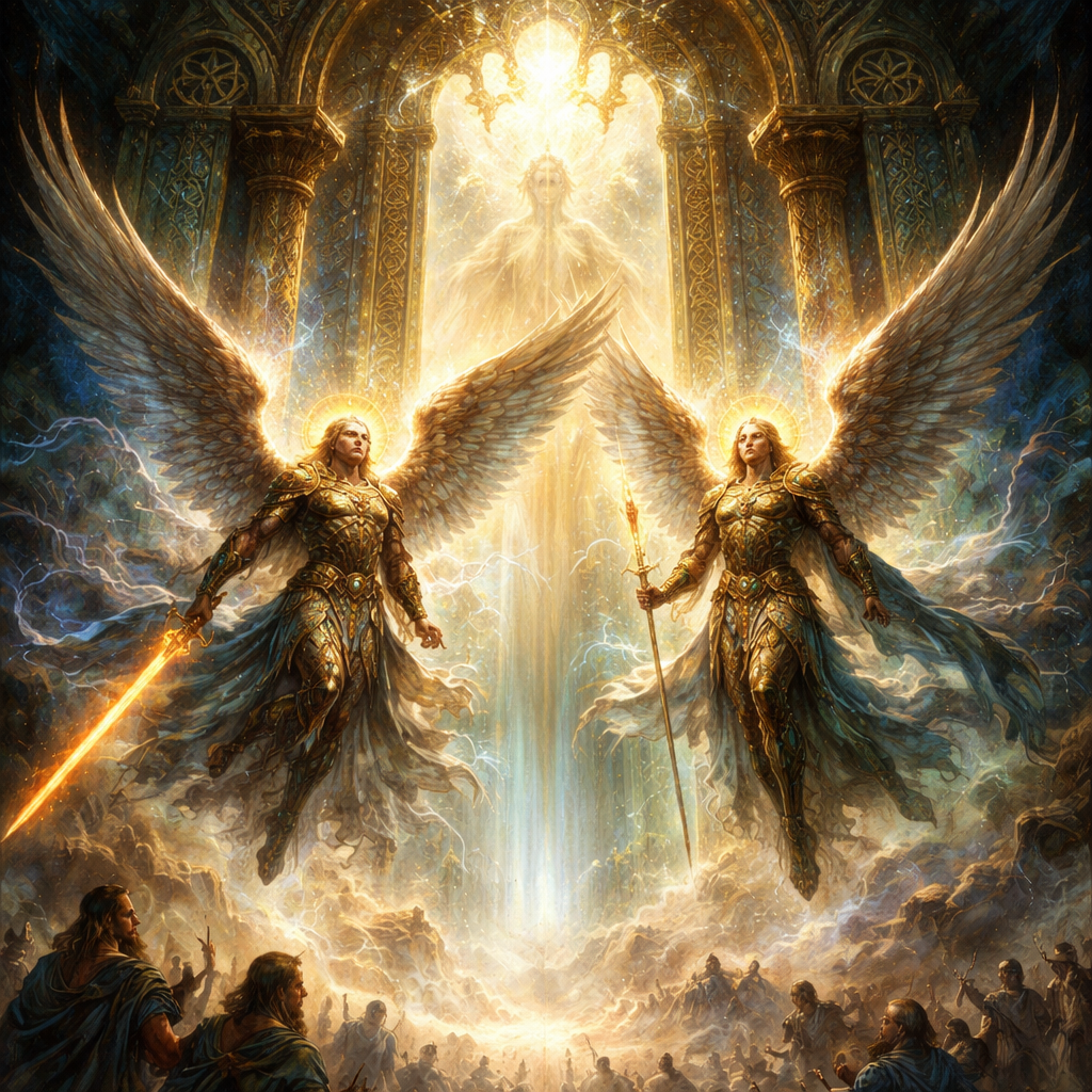 “Then the all-glorious, all-powerful, and true God, displayed his holy countenance, and opened the gates of heaven, from which two angels, dreadful of form, came down and were visible to all but the Jews.” (3 Maccabees 6:18, Brenton)