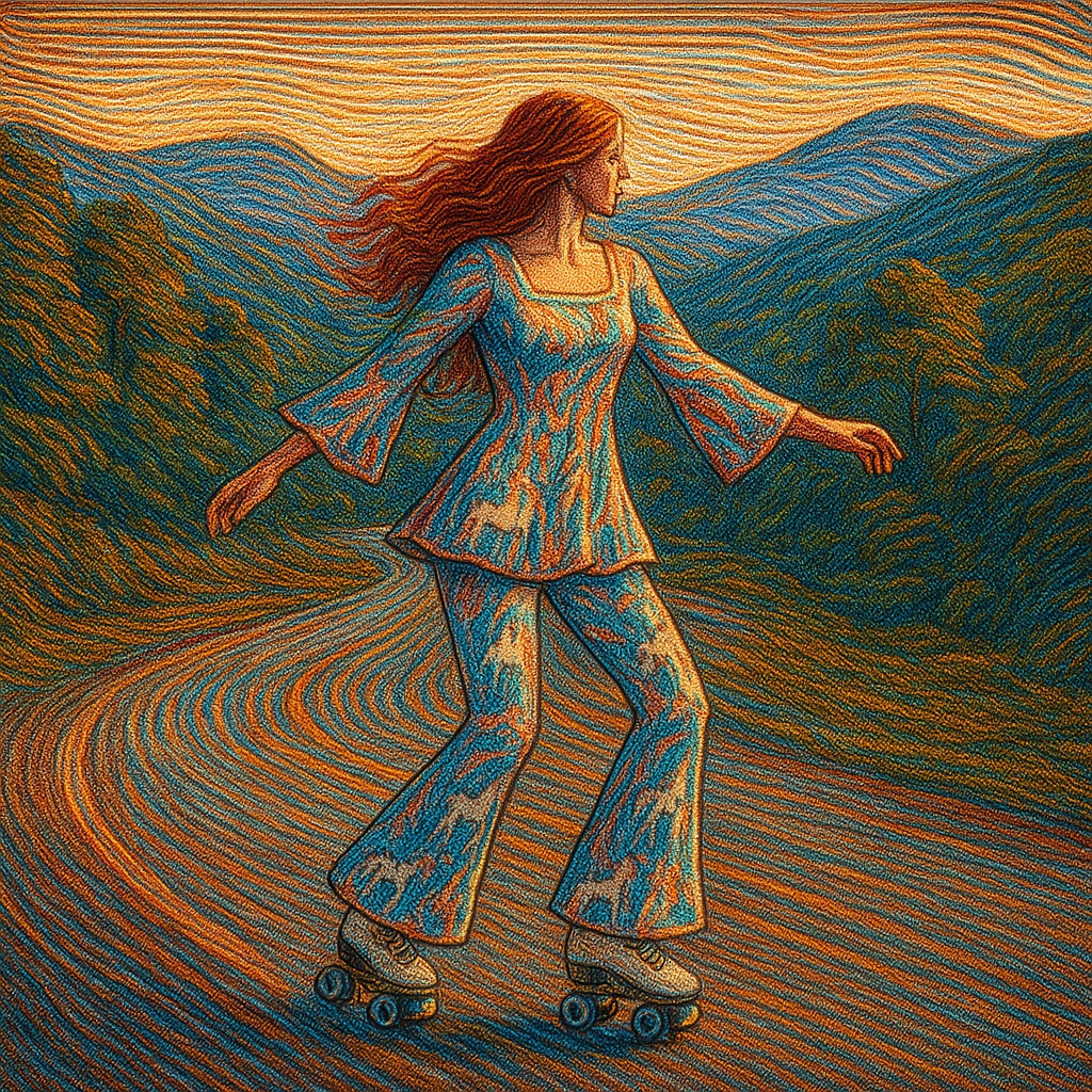 A captivating photograph of a woman with long, flowing red hair, gracefully roller skating on a winding, undivided backroad in the Appalachian Mountains, reminiscent of Shell Creek Road in Roan Mountain, Tennessee. She is dressed in a vibrant 70s-inspired outfit featuring bell-bottom pants with a light blue and pink pattern of white horses, and a matching tunic-style top with bell sleeves and a square neckline, flared at the waist. The late afternoon sun casts a warm glow, highlighting the lush green trees and distant mountain peaks. Her roller skates are a classic steel style. The overall mood is one of freedom, nostalgia, and natural beauty.