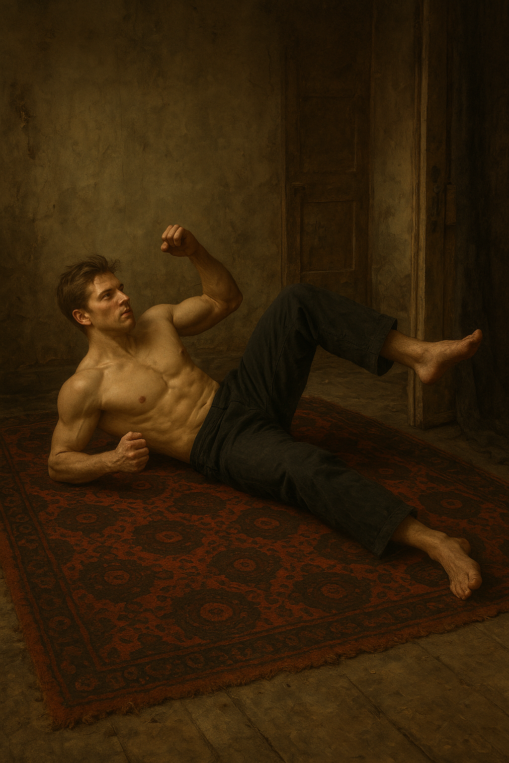 a shirtless man laying on a rug flexing his muscles