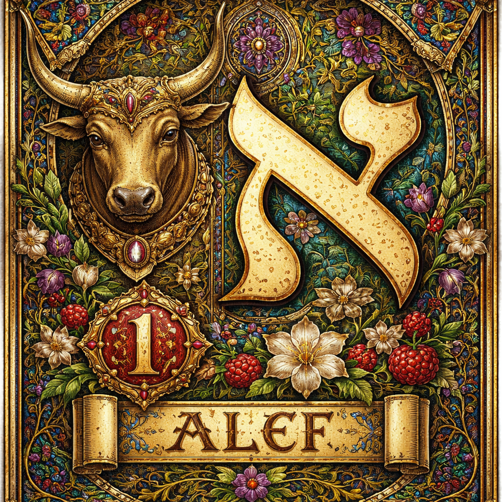 A picture of the Hebrew letter Alef including both the paleo symbol of the ox head "Ox, Strength, Leader" and modern א, Alef symbol, the number 1 and the name of the letter "Alef"