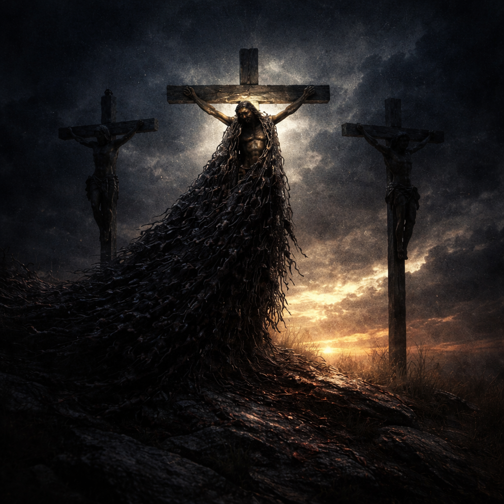 A visceral, raw, and highly texturally detailed conceptual artwork. In the center, three crude wooden crosses are silhouetted against a dark, stormy, indigo sky. The central figure, Christ, is "numbered" among two criminals, but his face is bathed in a faint, unseen celestial glow that the others lack. A massive, heavy, shadowy cloak, made of thousands of tiny, interwoven dark figures and faces (representing "the sin of many"), is visibly draped over his shoulders, weighing him down. Below the crosses, the stormy sky is breaking, revealing a sliver of intense golden dawn, hinting at the "portion with the great" yet to come. Symbolic, poignant, high contrast.“Therefore will I divide him a portion with the great, and he shall divide the spoil with the strong; because he hath poured out his soul unto death: and he was numbered with the transgressors; and he bare the sin of many, and made intercession for the transgressors.” (Isaiah 53:12, KJV)